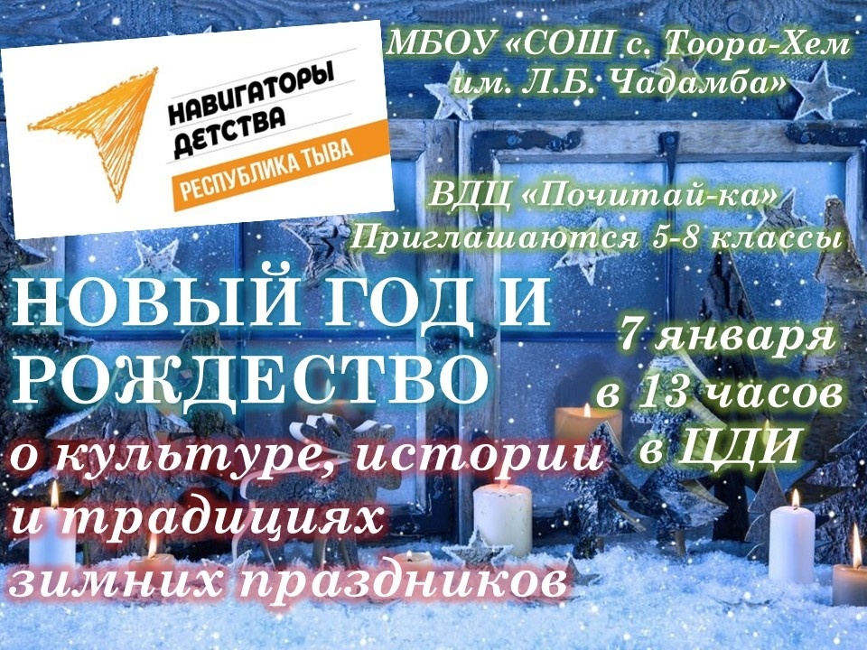 Дорогие ребята 5-8 классов!Приглашаем вас на познавательную программу *»Новый год и Рождество. О культуре, истории и традициях зимних праздников»*.Мероприятие будет организовано в рамках ВДЦ «Почитай-ка».Ждём вас 7 января в 13 часов в Центре детских инициатив (фойе, 2 этаж).#советник668530#НавигаторыДетства17 #Росдетцентр #Почитайка#Зимниеканикулы17 #МинобразованияТыва